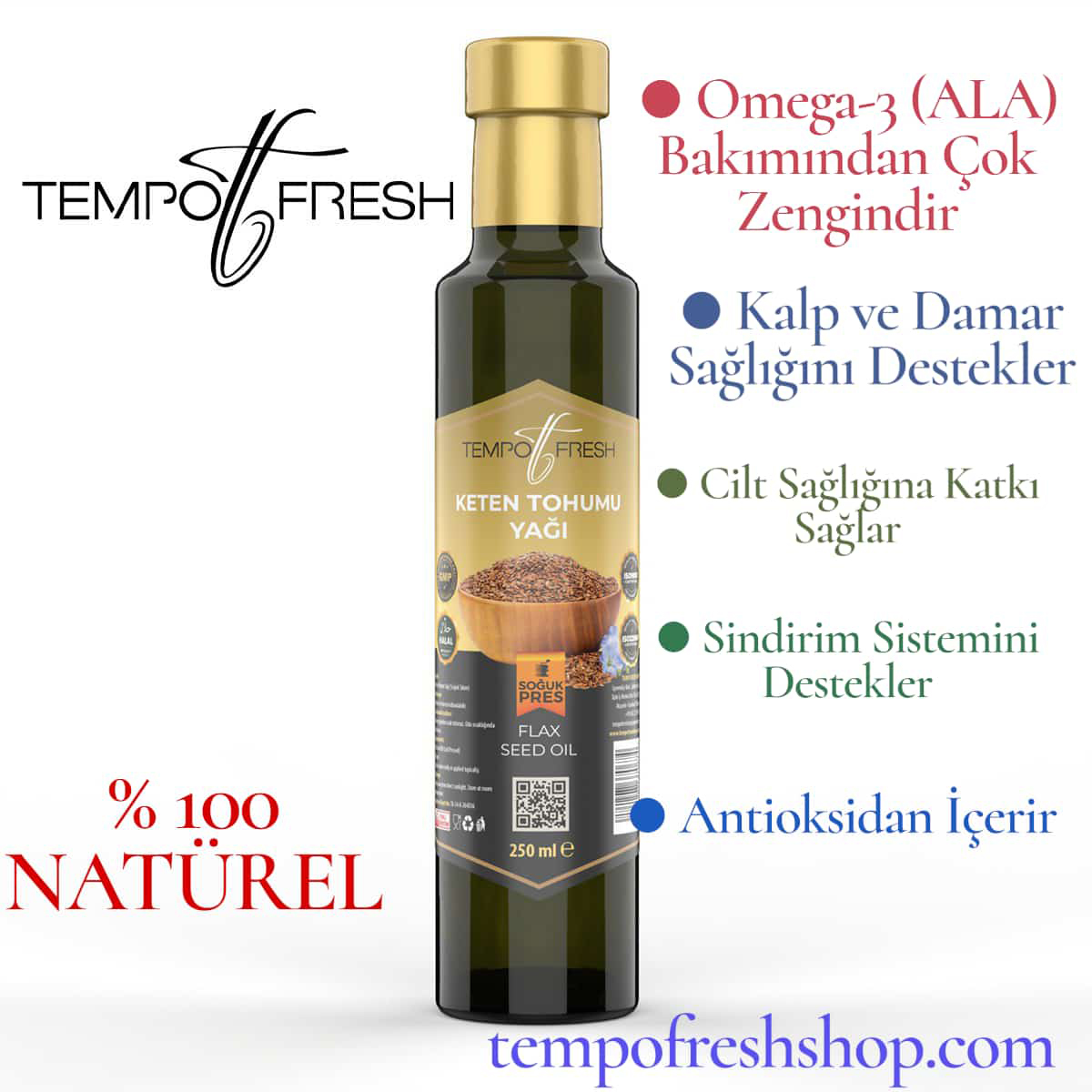 Keten Tohumu Yağı (TEMPOFRESH 250 ml), özellikle Omega-3 (ALA) içeriğiyle öne çıkan, beslenme ve bakım amaçlı kullanılan değerli bir bitkisel yağdır. Aşağıda tüm sorularını düzenli, net ve güvenli biçimde yanıtladım: